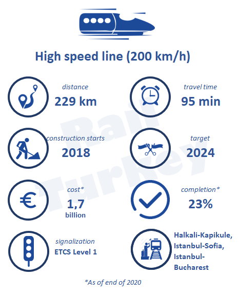 The new 229-km-long, double track, electrified and signalized line is being constructed between Istanbul and Kapikule.