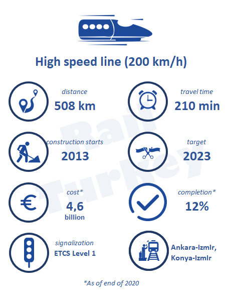 Construction of Ankara Izmir high speed line, connecting Turkish capital to Izmir, had started in 2013. 508-km-long line will be the most expensive high speed line project of Turkey. When completed, the travel time between two cities will drop down to 3.5 hours.