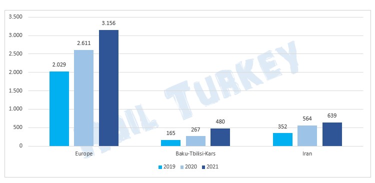 Biggest share in international transports belongs to westbound traffic between Turkey and Europe (about 75%). This traffic grew by 50% between 2019 and 2021. Even a bigger growth was seen in eastbound traffic. In first two years of pandemic, transport via Baku-Tbilisi-Kars railway was increased by 200% where via Iran by 100%.
