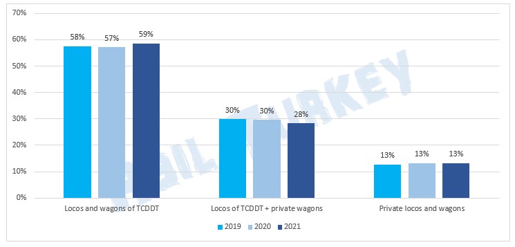 About 60% of freight transport is being done by TCDD locos and wagons. Private wagons have the second biggest share (30%) among all. Private wagons have been the first investment by private companies in rail transport and grew fast in last decade. The growth has almost stopped during pandemic where share did not increase, even decreased a bit. Rest, 13%, is being done by locos of private operators and wagons belong to them.