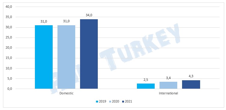 Domestic rail transports were stable in 2020 and increased by 10% in 2021. Demand increased more, but operators could not meet them all. On the other hand, increase in international transports is more charming. Volumes carried by export/import trains increased by 35% in 2020 and 24% in 2021. This growth was caused by shift from truck transport to rail as well es TCDD Tasimacilik’s support on international transports.